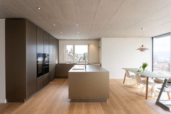 This kitchen on the attic of a Zurich apartment building impresses with its luxurious features.
