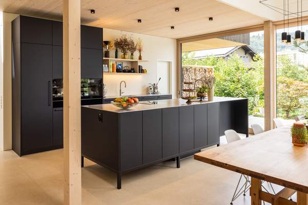 Kurt Keller AG created a kitchen-diner that, thanks to its high design and quality standards, becomes the focal point of the living space and creates a modern and inviting atmosphere. The design is inspired by Nordic-Japanese influences and impresses with its timeless restraint. The kitchen furniture in soft matt black is from the FEEL range and offers plenty of storage space. The stainless steel worktop from FRANKE is easy to clean and has a classic, semi-matt and slightly reflective surface thanks to its band finish.
