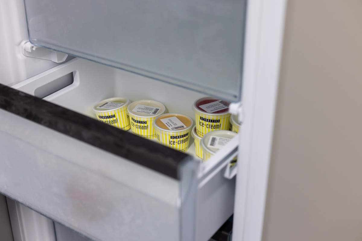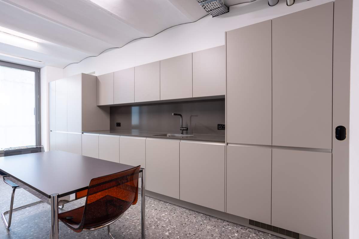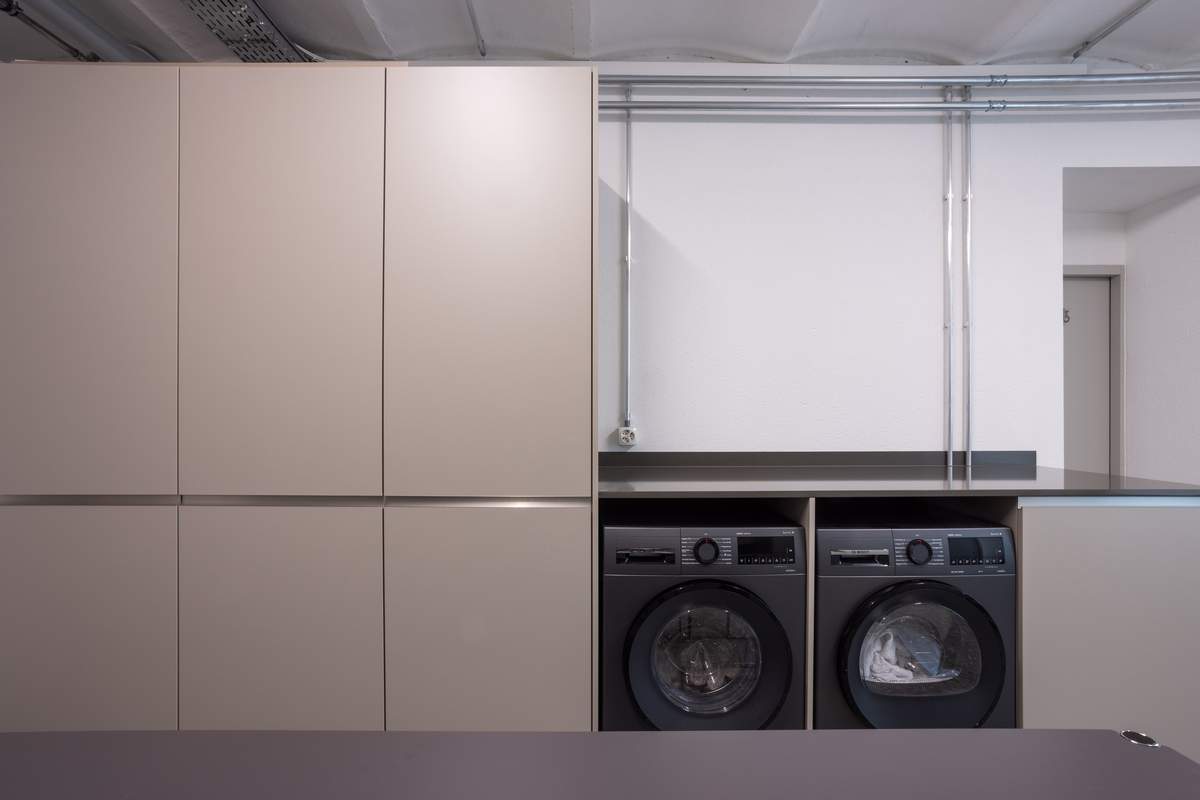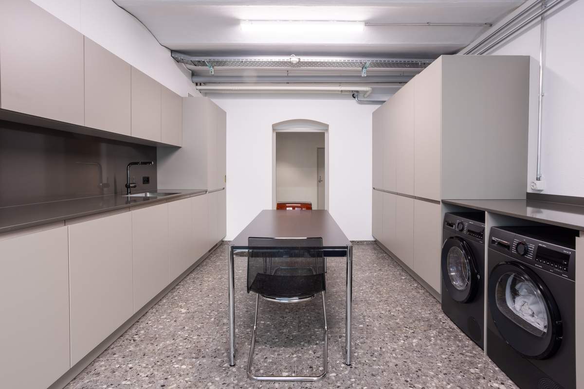 Für private Feiern und Events entstand im Keller eine Arbeitsküche, die zugleich als Waschküche dient. Robuste Kunstharzfronten, viel Stauraum und ein grosser Kühl- sowie Gefrierschrank sorgen für Effizienz. Auf eine klassische Kochstation wurde verzichtet, da die Küche speziell auf die Zusammenarbeit mit externen Caterern ausgelegt ist. Das reduzierte Design fügt sich optimal in den bestehenden Raum ein. Auch die Kellerdecke wurde optisch integriert: Die Blenden und Abdeckungen passen sich harmonisch an die Gewölbestruktur an.