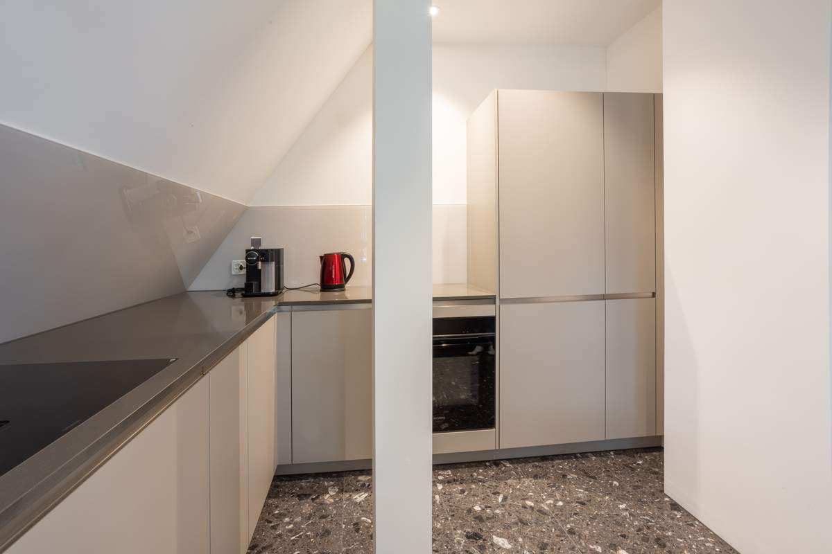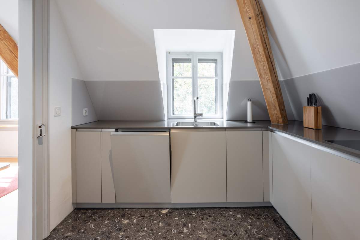 Im Obergeschoss sorgt die Gästeküche für ein harmonisches Zusammenspiel der Materialien. Farbgebung und Oberflächen greifen die Gestaltung der Küche im Untergeschoss auf und schaffen ein einheitliches Bild. Bei der Planung galt es zudem, die vorhandenen Dachschrägen zu berücksichtigen.