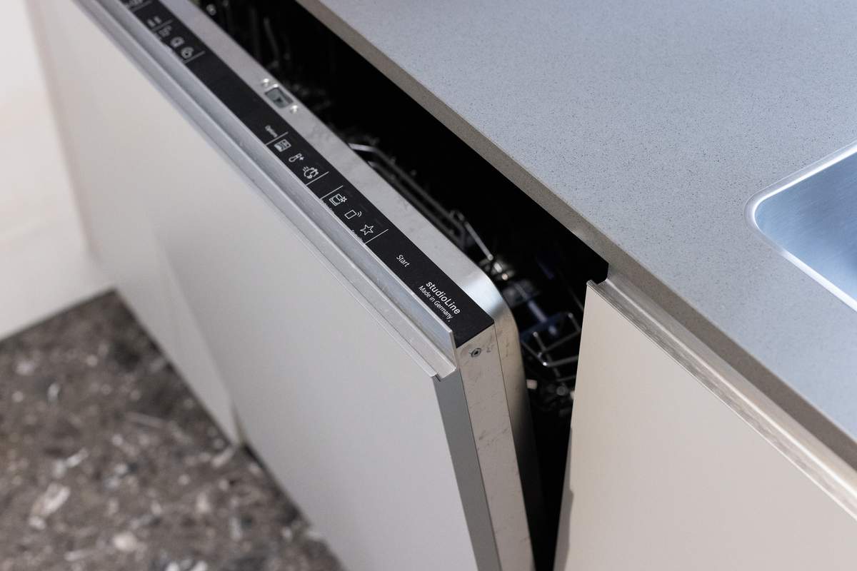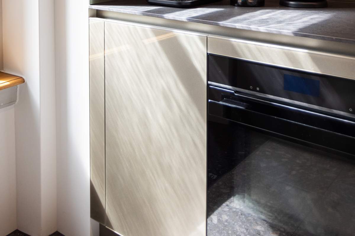 Ein weiteres Highlight ist ein massgefertigtes Schrankabteil, das den Fernseher versteckt. Mit einem Handgriff verschwindet das Gerät hinter den Fronten, womit die klare Linienführung der Küche erhalten bleibt. Unter dem Fensterbereich bieten die integrierten Schränke weiteren Stauraum.